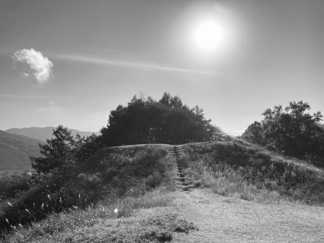 全長約65m、東日本で最古級の前方後方墳。後方部の幅約33m・高さ約4m、前方部の幅約26m・高さ約3.5m、葺石・埴輪は確認されていない。埋葬施設は後方部中央に構築された川原石による竪穴式石室(礫槨)で長さ約5.5m・幅約1.5m・深さ約1m、出土した斜縁獣帯鏡や鉄剣、鉄鏃、ガラス小玉、土師器などは長野県宝に指定されている。3世紀後半の築造。 |