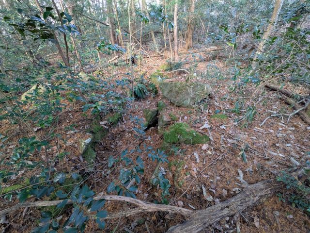 尾根先端に前方部を北西に向けた、全長14.5mの前方後円墳が有ります。小さな古墳ですが、後円部西側に盗掘坑見たいな凹みが有り、その下方に天井石1石が転んでいる事から、横穴式石室がこの位置かと想像します。