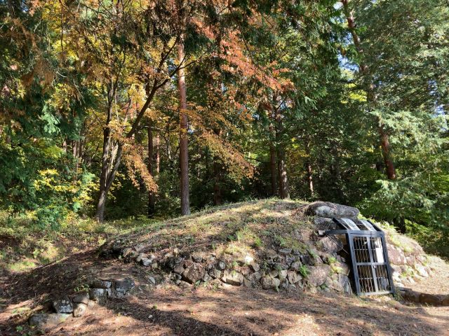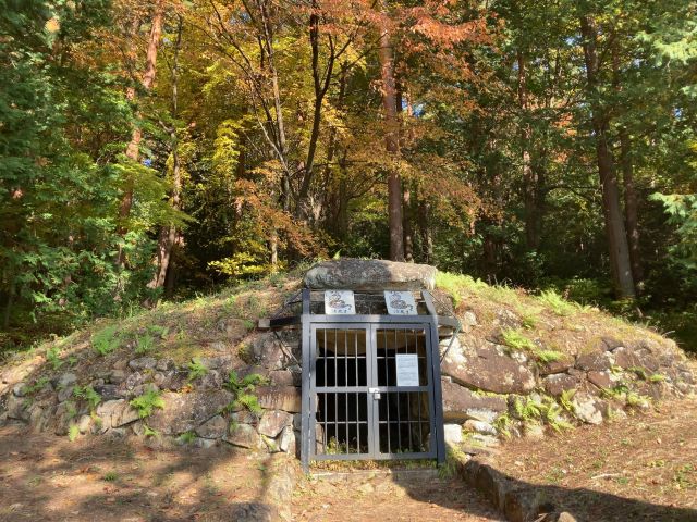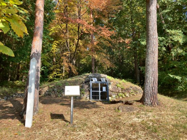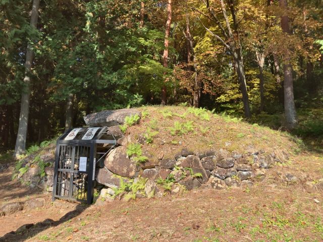 諏訪湖北岸の丘陵南斜面に立地。直径約12mの円墳で葺石・周溝を備える。埋葬施設は南に開口する無袖型の横穴式石室で長さ約5.7m・幅約1.7m、室内は赤色顔料(ベンガラ)で彩色されている。直刀や鉄鏃、刀子などが出土した。7世紀末頃の築造。市指定史跡、1979(昭和54)年指定。 |