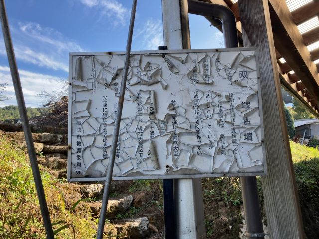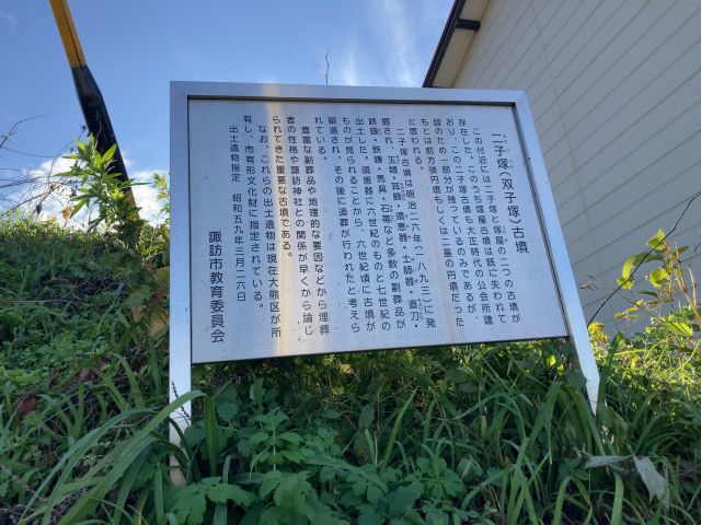 二子塚の名前からも、2基の円墳か前方後円墳だったとされている。大正時代に墳丘上に公会所建設があったため、残っているのは一部分。現在は大熊公民館の隣にある。明治時代の発掘により玉類、耳飾り、須恵器、土師器、直刀、鉄鏃、馬具などが出土した。 |