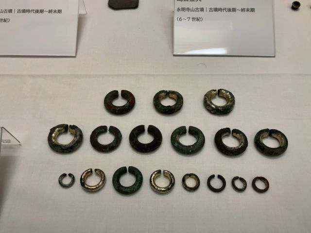 永明寺山の南側には26基ほど古墳が見つかっている。2017(平成25)年に調査され、復元保存された。推定径約11m、開口部底面からの高さ4.4m。石室は横穴式で、全長7.2m、玄室長5.2m、幅1.8m、高さ1.4m。副葬品として直刀6本、方頭柄頭(ほうとうつかがしら)、刀子10点、鉄鏃91点、馬具16点、勾玉を含む玉類71点、耳環17点、須恵器3点、土師器3点が出土した。直刀6本のうち、刀身98cmの刀の鍔と柄縁金具、96.5cmの刀の鍔に銀象嵌があった。 |