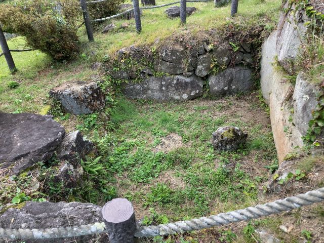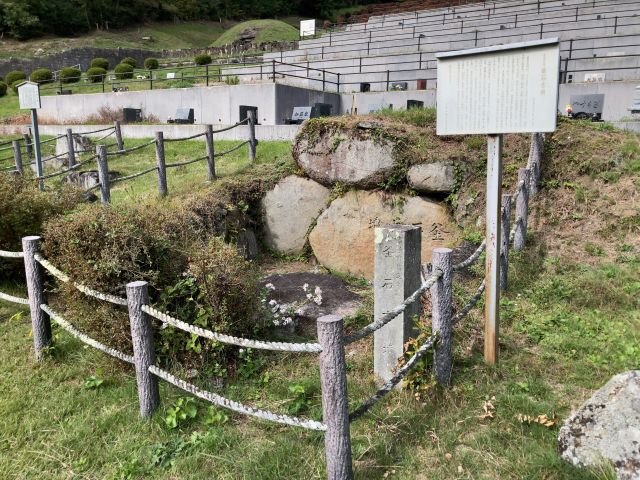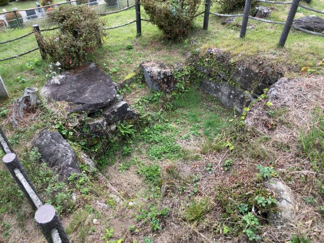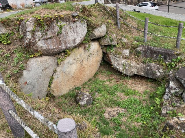両袖型の横穴式石室をもつ円墳で、基礎石、奥壁、側壁が残る。石室は奥行き4.5m、高さ2.3m。出土品は勾玉、管玉、切子玉、金環、須恵器、土師器、小刀子、直刀、刀装具。直刀には銀象嵌装大刀が含まれていた。6世紀後半の築造。市指定史跡、1967(昭和42)年指定。 |