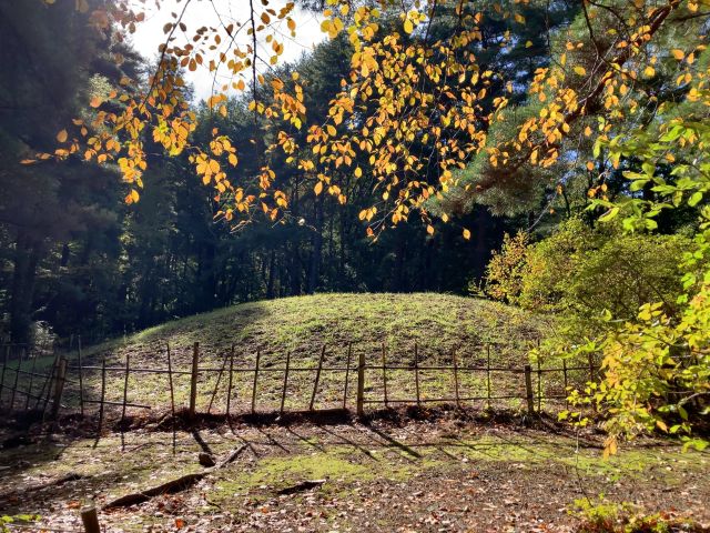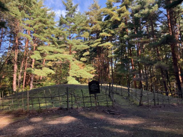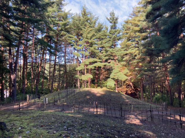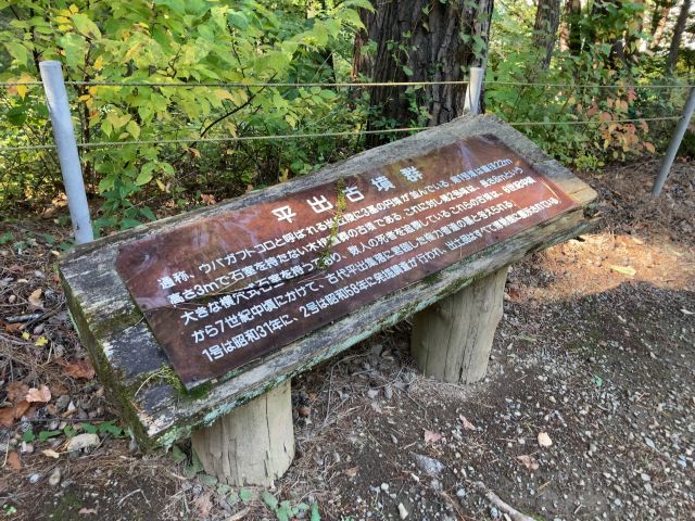 平出博物館歴史公園内のウバガフトコロと呼ばれる丘陵に3基がある。1号墳は直径22m、高さ3m。木棺直葬で太刀、鉄鏃、刀子が出土しており、博物館蔵。 |