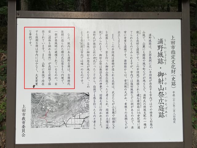 飯縄山(932.3m)の山腹、標高610mほどにある。中世の山城である浦野城の平坦地に接し、一部が土塁として改変されている。横穴式石室が開口する。石室は大きめの石が使われている。 |