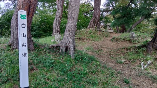朝日山公園内にあります。古墳のすぐ下に白山横穴墓もあり、開口部が確認できます。前方後方墳あるいは円墳との情報もありましたが、岩沼市の岩沼市遺跡地名表から前方後円墳とします。 |