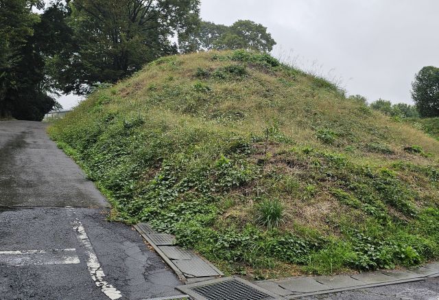 駐車場から奥へ行き、右折し道を上っていくと柵で囲まれた道が道にあります。その時に古墳があります。