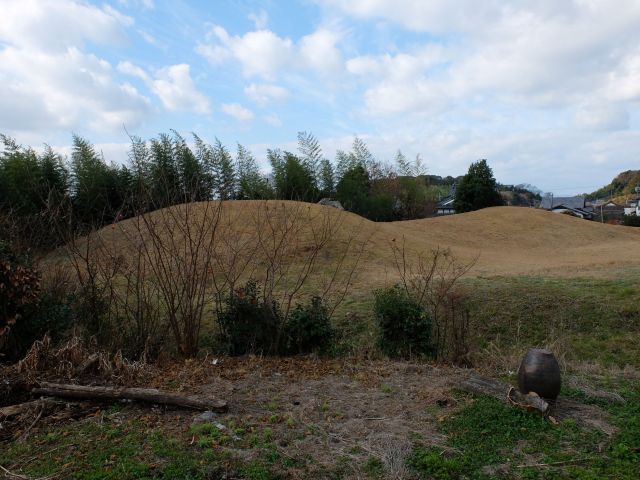石室発見の道路工事は昭和3年、アセスもへったくれも無かっただろうに良く埋め戻しの判断されたもんだと感心しました。後円部には古い石段がありお社があったみたいなので地元の信仰が厚かった様です。そのため破壊はほとんどなかったどころか、前方部と後円部の境のくびれ部には須恵器の大甕や器台を並べた祭祀の痕跡残っていました。いつか予算がついて石室の調査もされると良いな・・・